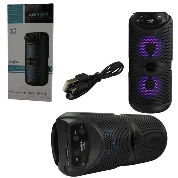 Estilo: alto-falantes duplos de 6,5 polegadas Alto-falante de 3 polegadas x 2 com luz LED para tocar música, conecta via Bluetooth, USB e Micro SD, tem alcance aproximado de 10 metros. Sua bateria é recarregável e dura 4 horas contínuas, incluindo um cabo de carregamento. Possui a função TWS, você pode conectar dois bicos ao mesmo tempo, modelo sem a necessidade de cabo Modelo: GTS-1557 Medidas: Altura: 23 cm Largura: 10 cm De cor negra Entradas: Micro SD e USB Acessórios: cabo de carregamento V8 Modo: Bluetooth/Rádio FM