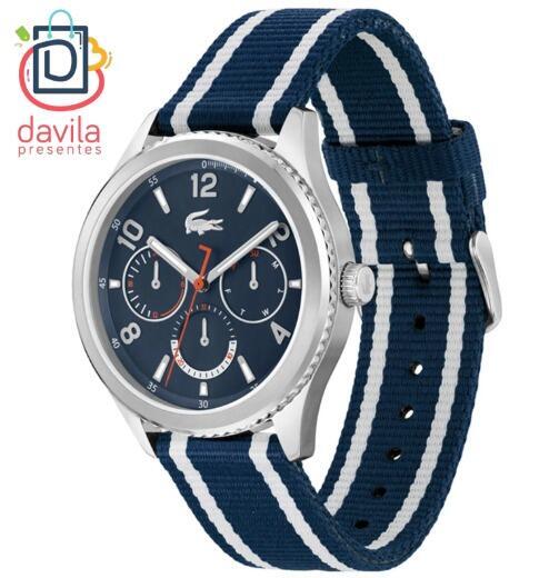 RELOGIO MASCULINO LACOSTE FUNDO AZUL MARINHO PULSEIRA NYLON AZUL E BRANCO LACOSTE 1159 VIVARA JOIAS