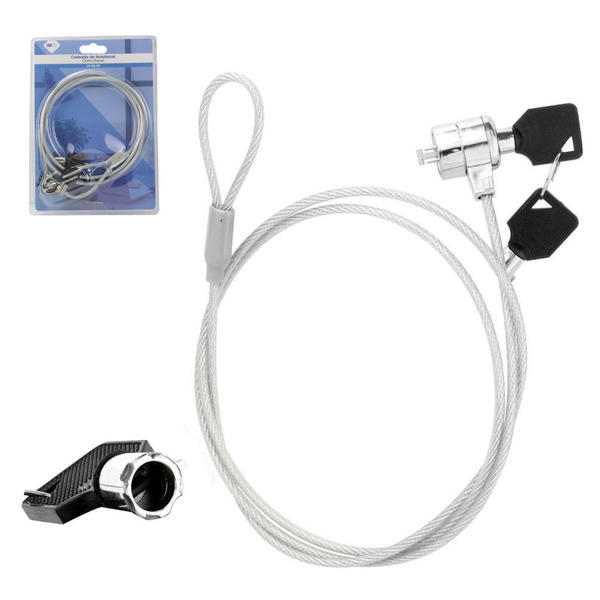 Confeccionado em aço super resistente, Fácil de usar, basta passar o cabo em algum objeto fixo e prender o cadeado no notebook. Tipo Segredo chave.